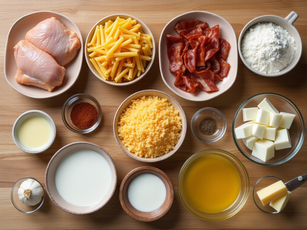 Let’s take a closer look at the key ingredients that make Chicken and Bacon Pasta Bake so indulgent and flavorful: