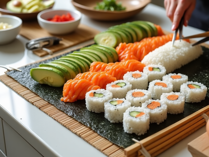 - Add fish, avocado, and cucumber as fillings.