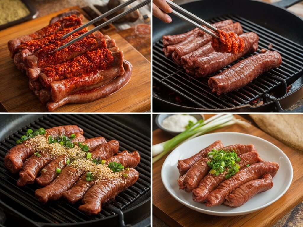Place the marinated beef intestines on the grill or in the skillet. Grill for 5-7 minutes per side, turning occasionally until the intestines are crispy on the outside and cooked through on the inside. Be careful not to overcook them, as they can become tough.